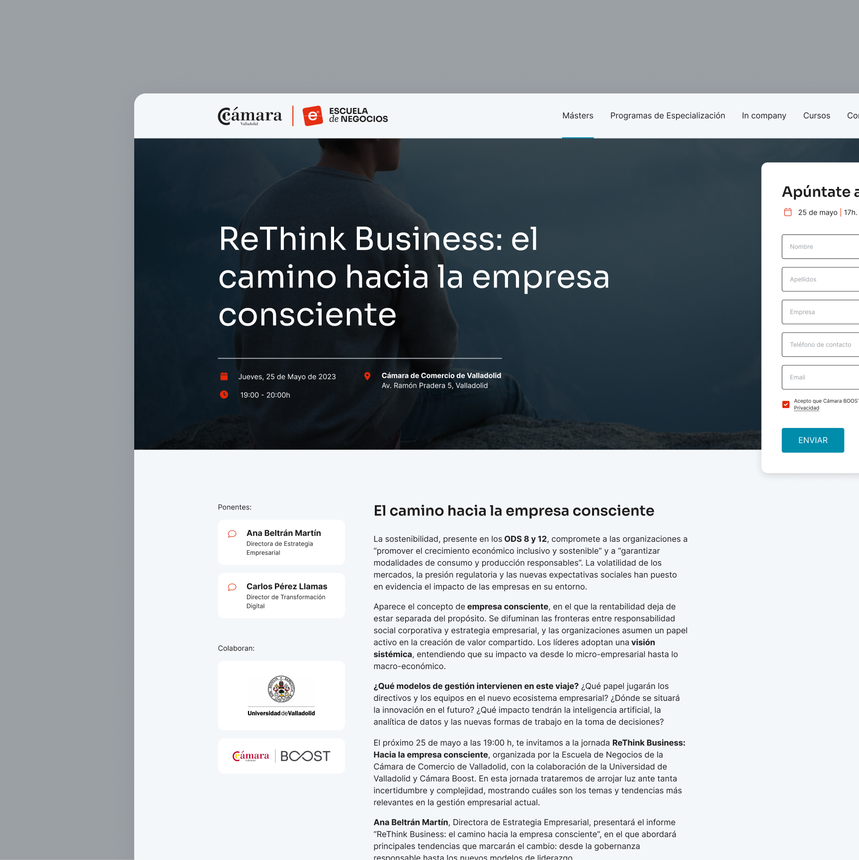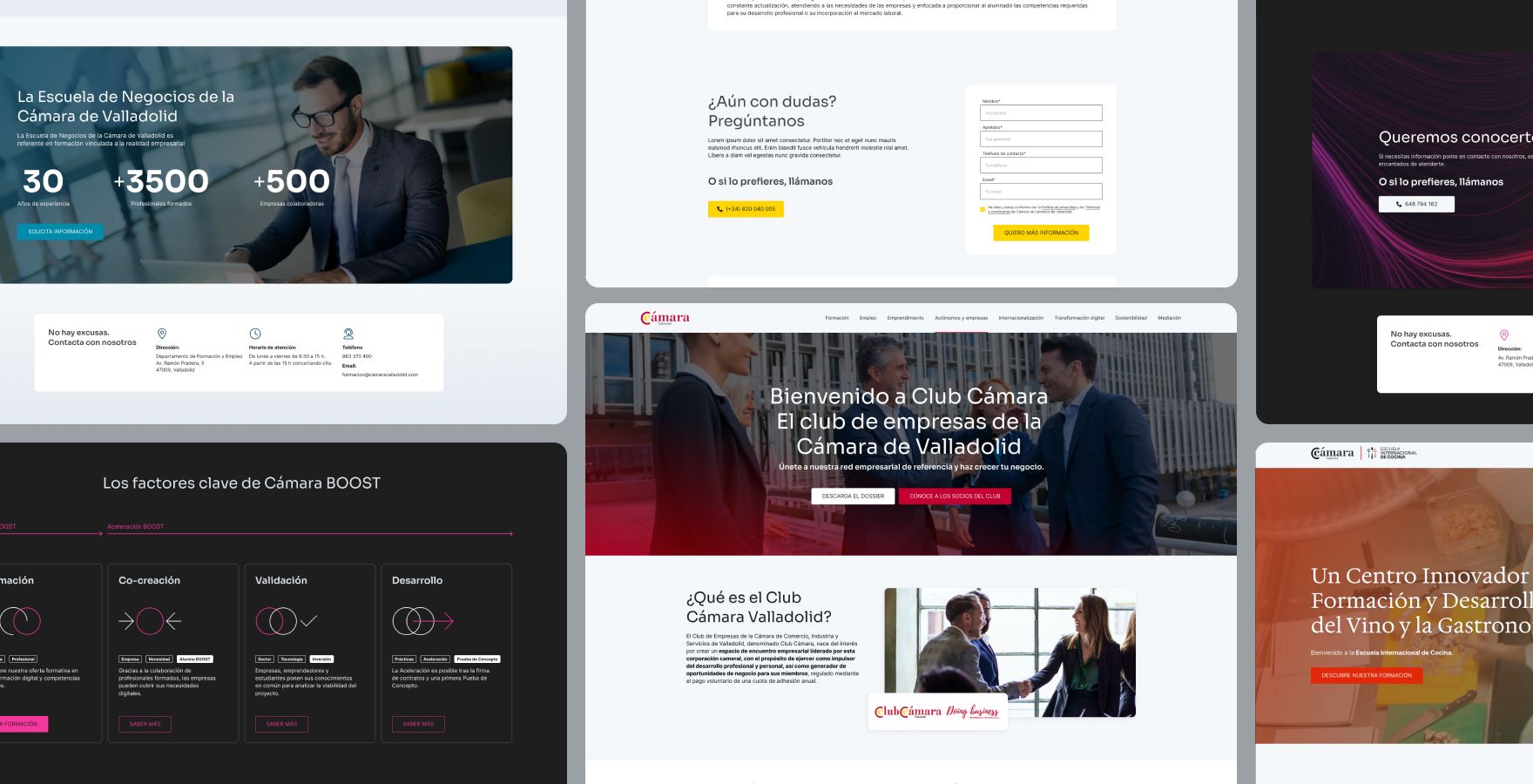 Este proyecto no se limitaba solo al desarrollo de una web, sino a la generación de todo un sistema que permitiese generar el site de la organización principal —el de la Cámara de Comercio de Valladolid— y el de sus servicios formativos: Cámara Boost, Escuela de Negocios, Escuela Internacional de Cocina y Formación Profesional. Es decir, necesitaban rediseñar 5 webs y que todas convivesen bajo un mismo ecosistema de diseño.